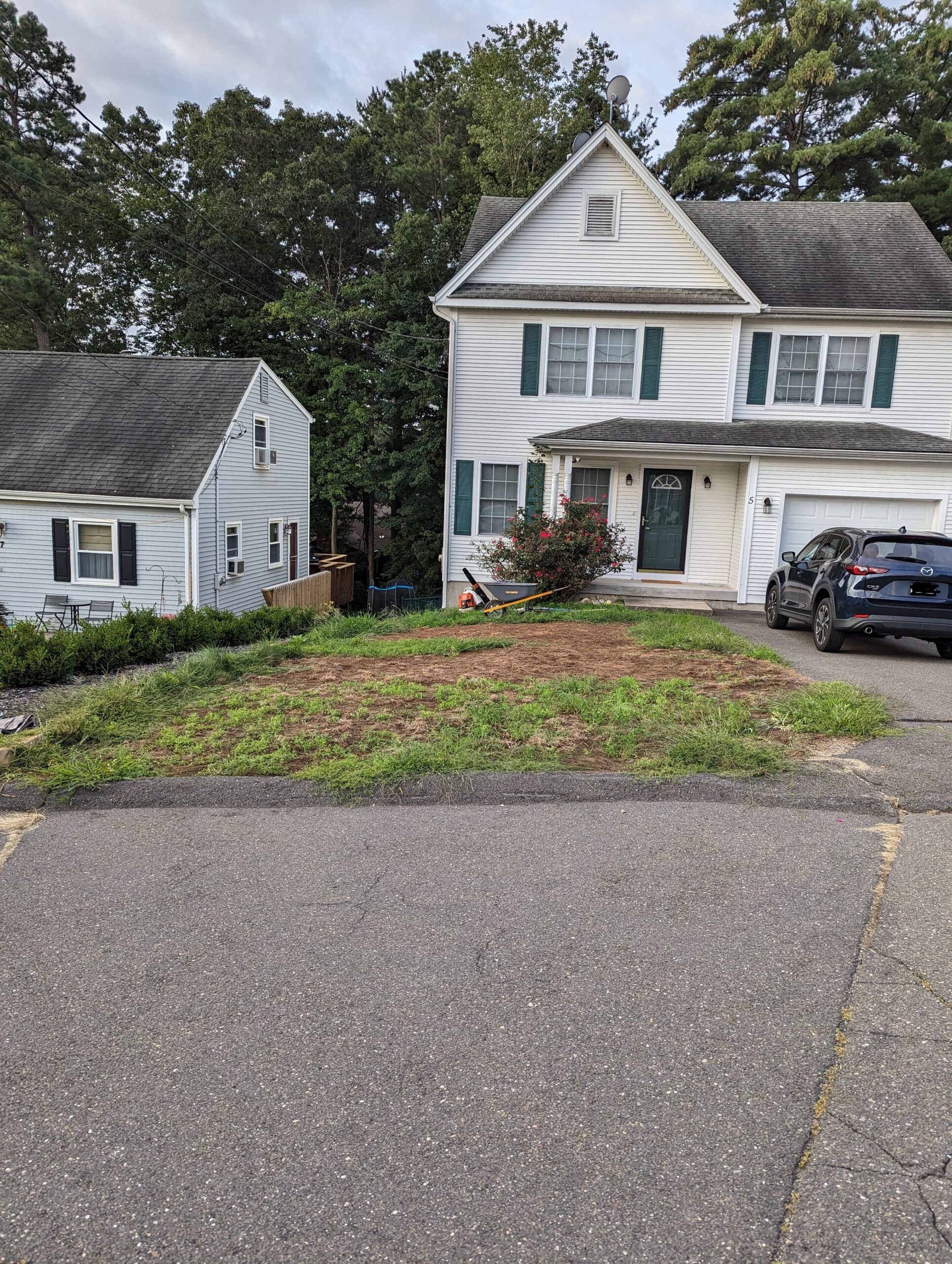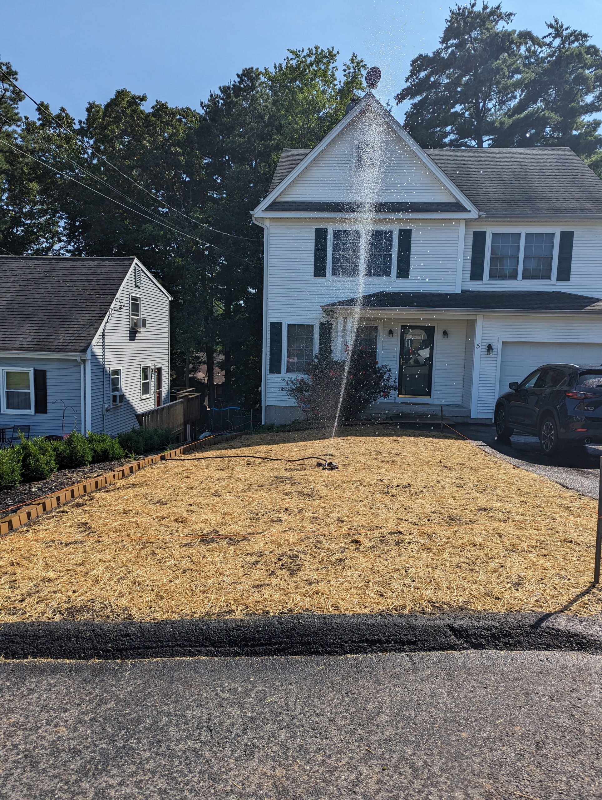 When seeding a new lawn preparation is key. I went ahead and tore out all the existing weeds and got everything down to bare soil. I then tilled the soil to loosen it up. After I was done I added the seed and covered it with a weed free straw. I helped setup the customer automatic sprinkler that he had chose to use. He was really happy with the result and he will be even happier once he has a full grown new front yard area he can be proud of.